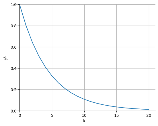 The value of receiving a reward r after k+1 time steps is \gamma^k \, r.