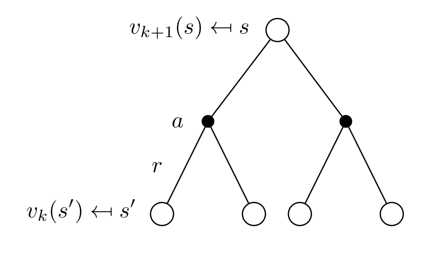 V_{k+1} (s) \leftarrow \sum_{a \in \mathcal{A}(s)} \pi(s, a) \, \sum_{s' \in \mathcal{S}} p(s' | s, a) \, [ r(s, a, s') + \gamma \, V_k (s') ] \quad \forall s \in \mathcal{S}