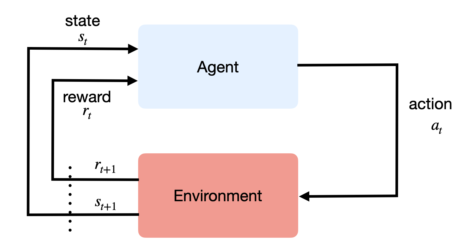 State transitions (s_t, a_t, s_{t+1}) are governed by transition probabilities p(s_{t+1} | s_t, a_t).