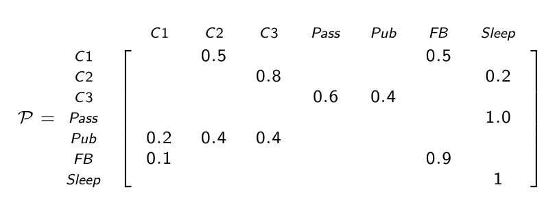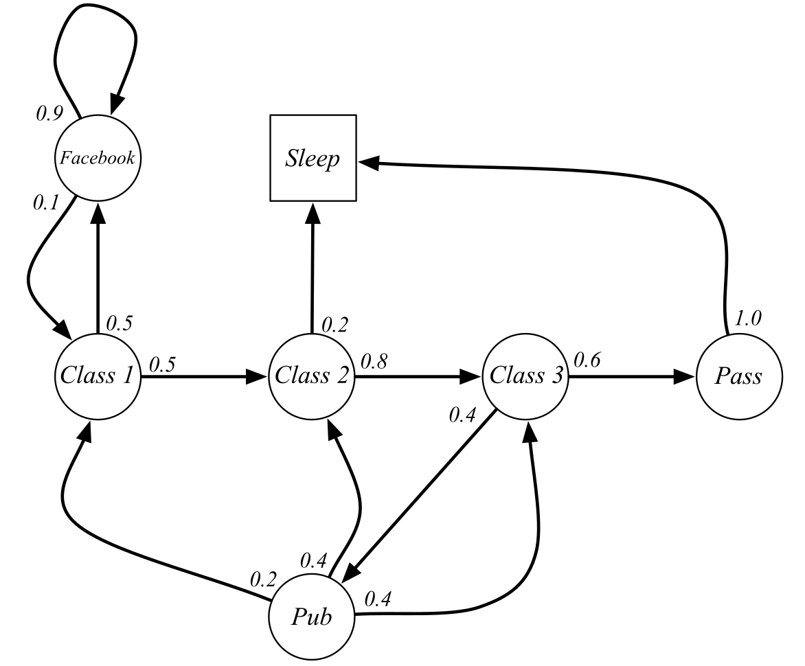 For example, the probability 0.8 of transitioning from “Class 2” to “Class 3” is the same regardless we were in “Class 1” or “Pub” before.