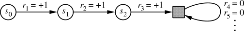 R = 0 + \gamma \, 0 + \gamma^2 \, 0 + \gamma^3 \, 10 + \ldots = 10 \, \gamma^3