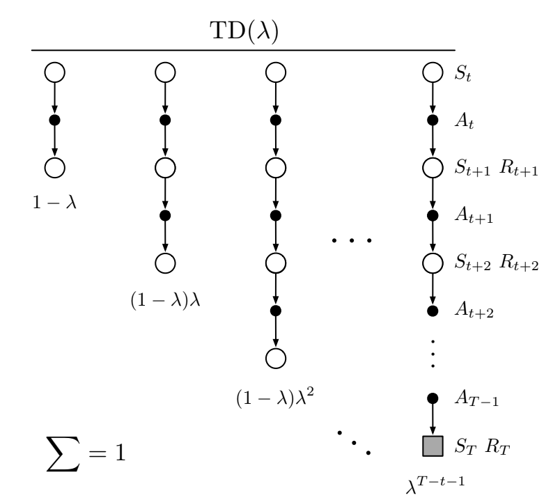 R^\lambda_t = (1 - \lambda) \, \sum_{n=1}^\infty \lambda^{n-1} \, R^n_t