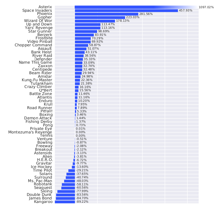 Some games are still badly performed (e.g. Montezuma’s revenge), as they require long-term planning.