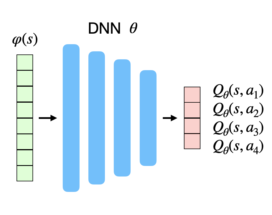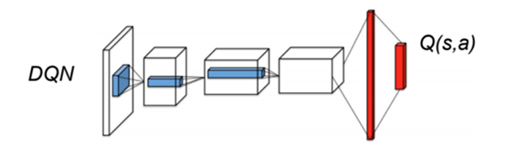 The value Q_\theta(s, a) of each possible action in a given state is approximated by a convolutional neural network.