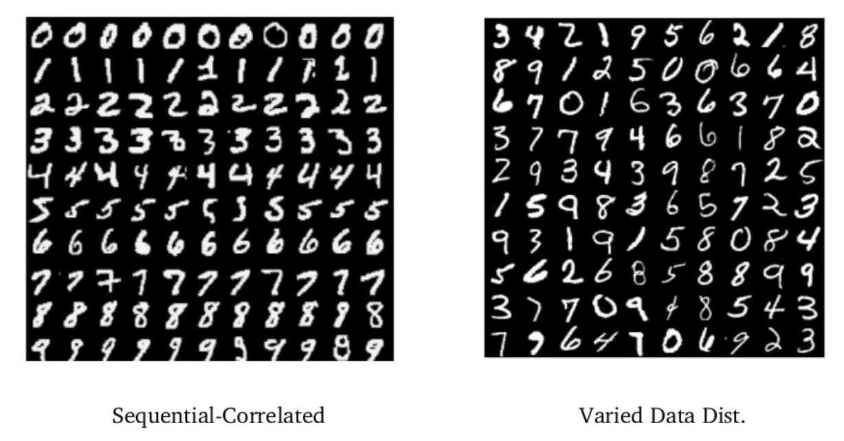 In RL, we create the “training set” (transitions) during training: the samples are not i.i.d as we act sequentially over time.