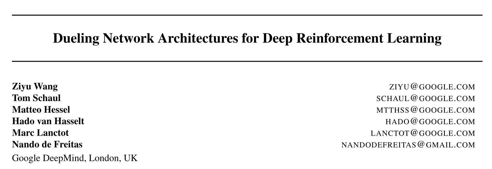 Wang et al. (2016) Dueling Network Architectures for Deep Reinforcement Learning. arXiv:1511.06581.
