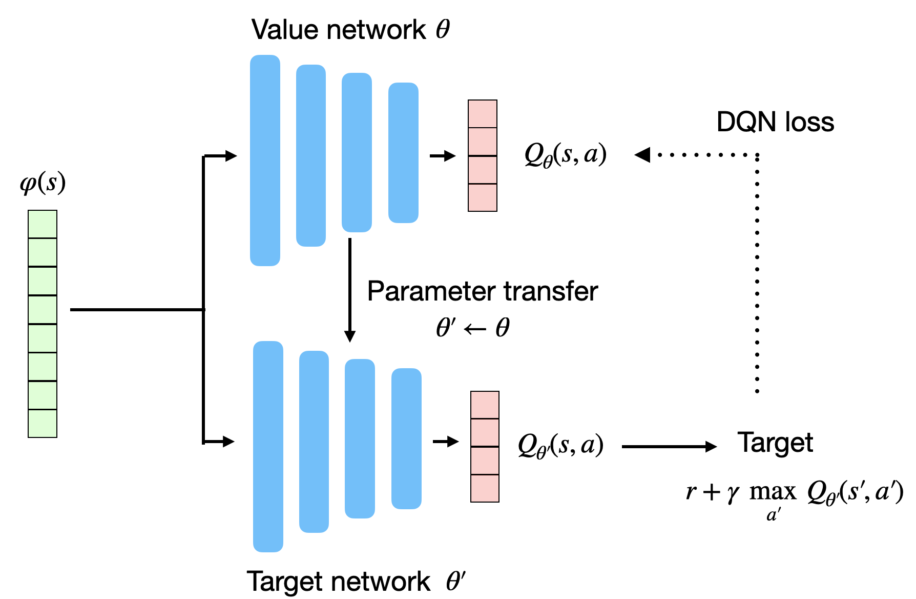 \mathcal{L}(\theta) = \mathbb{E}_\mathcal{D} [(r + \gamma \, \max_{a'} Q_{\theta'}(s', a')) - Q_\theta(s, a))^2]