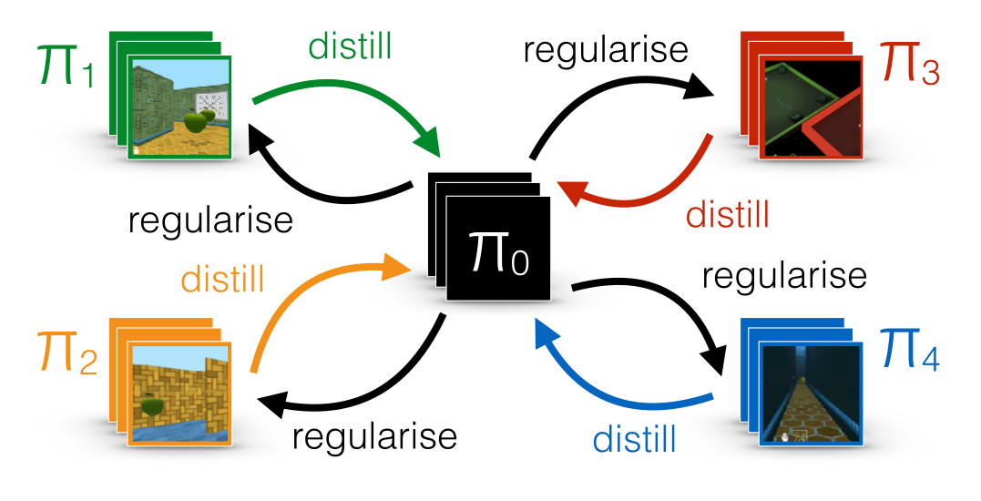 Each learning algorithms learns its own task, but tries not to diverge too much from a shared policy, which turns out to be good at all tasks.