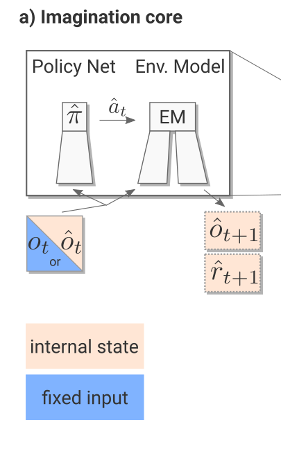 Take home message: given the current observation o_t and a policy \hat{\pi}, we can predict the next observation \hat{o}_{t+1} and the next reward \hat{r}_{t+1}.