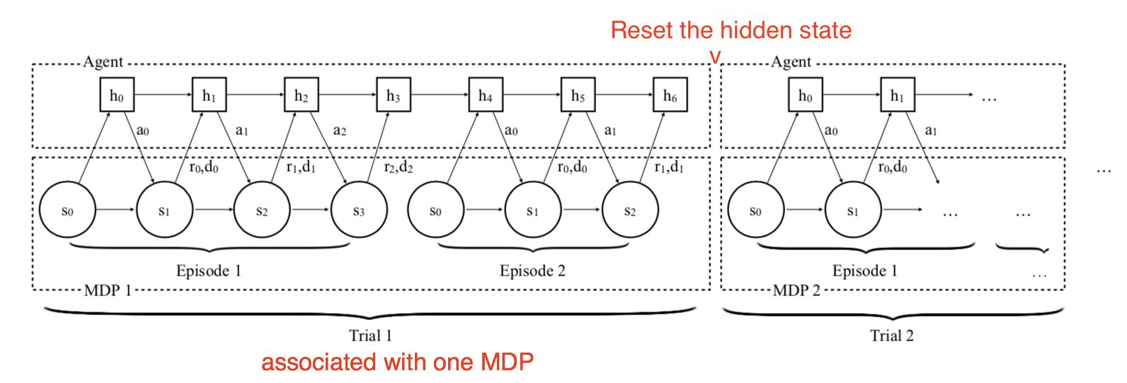 RL^2 Duan Y, Schulman J, Chen X, Bartlett PL, Sutskever I, Abbeel P. 2016. RL^2: Fast Reinforcement Learning via Slow Reinforcement Learning. arXiv:161102779.