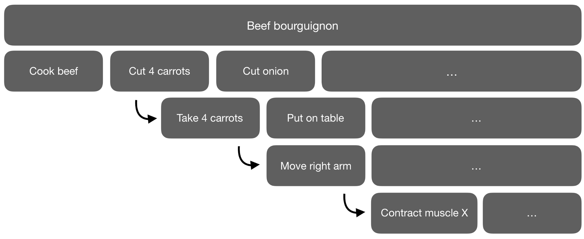 But how do you perform these high-level actions? Break them into subtasks iteratively until you arrive to muscle activations.